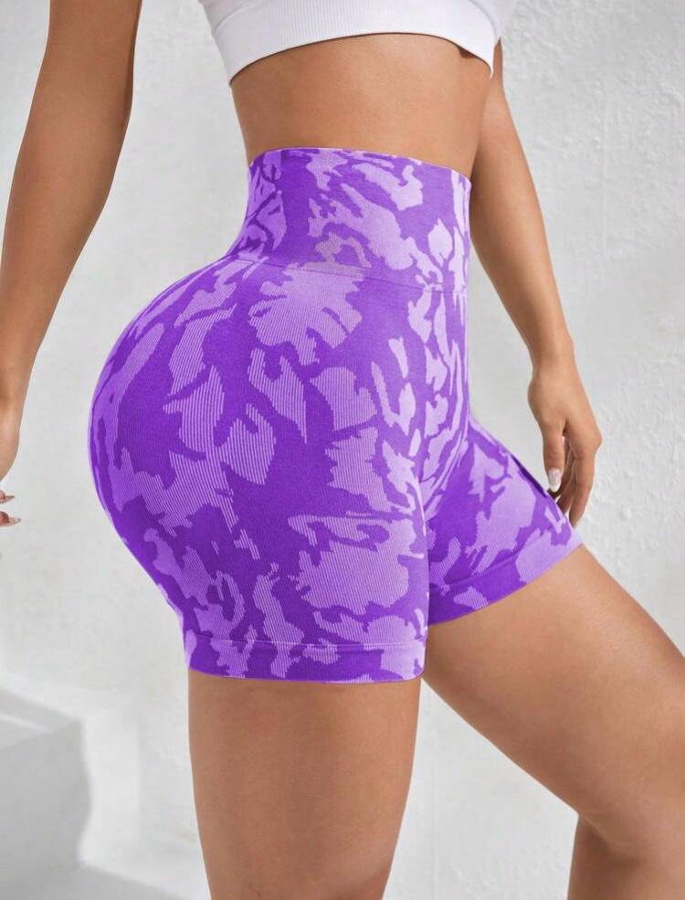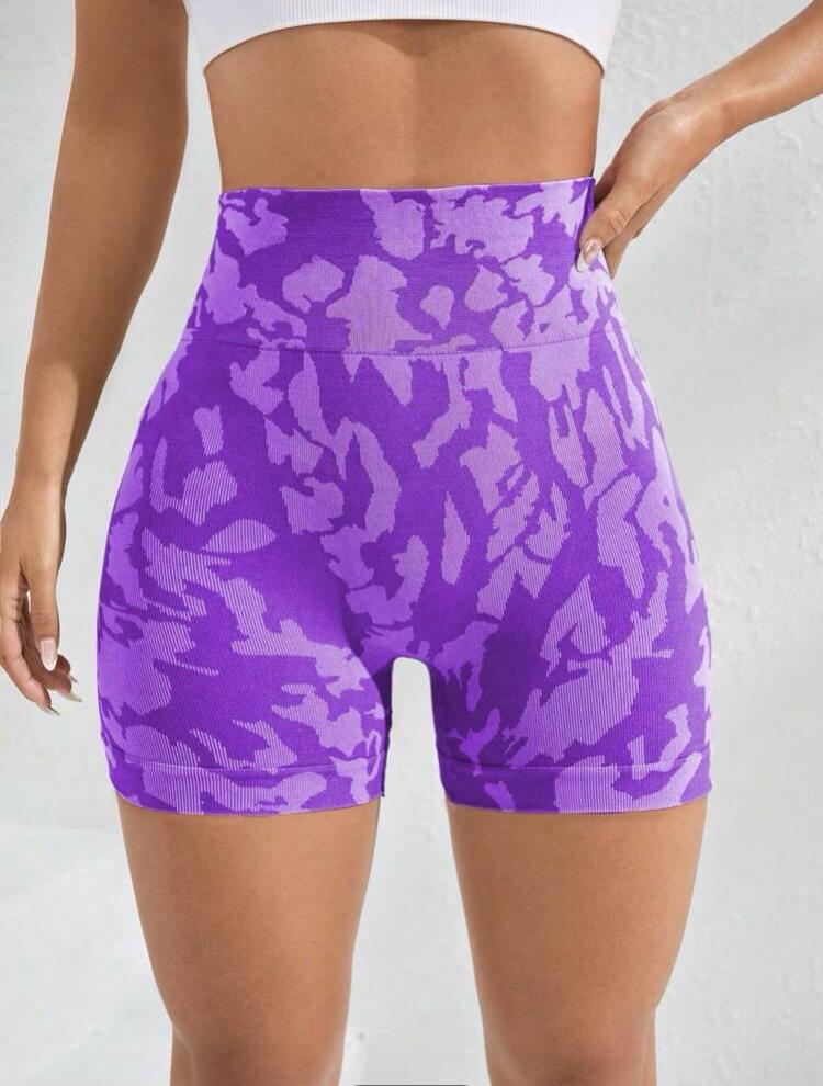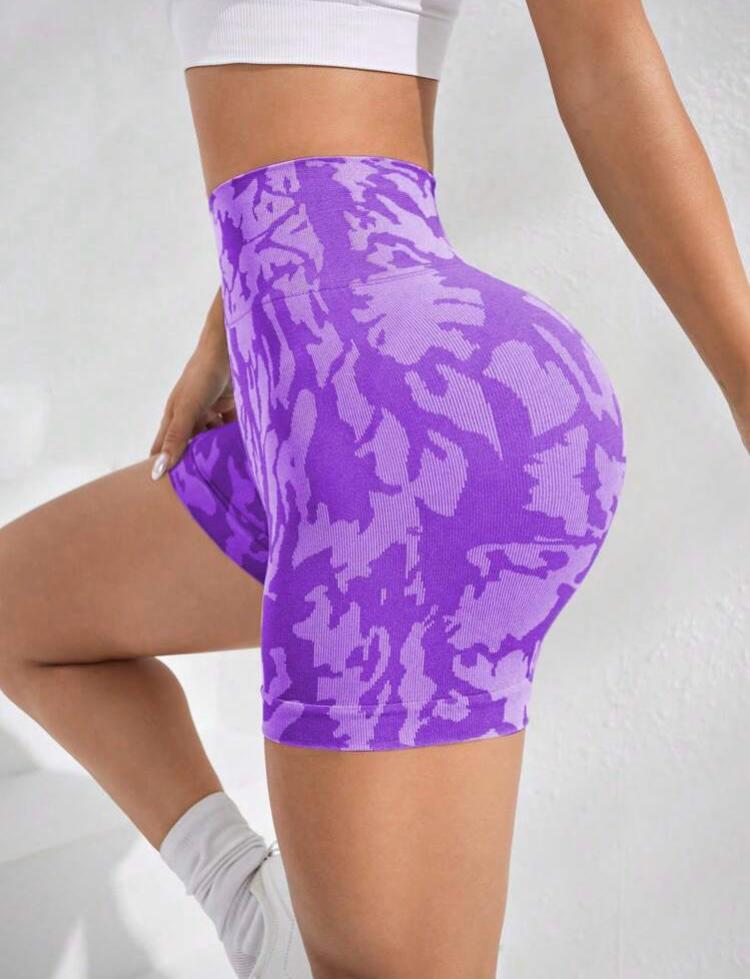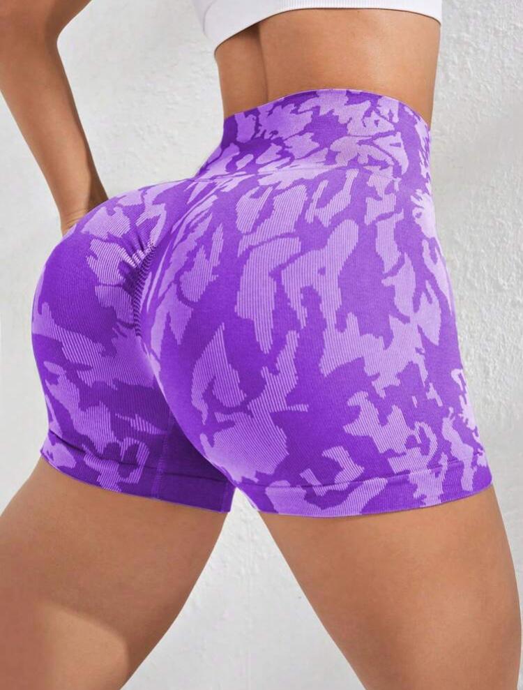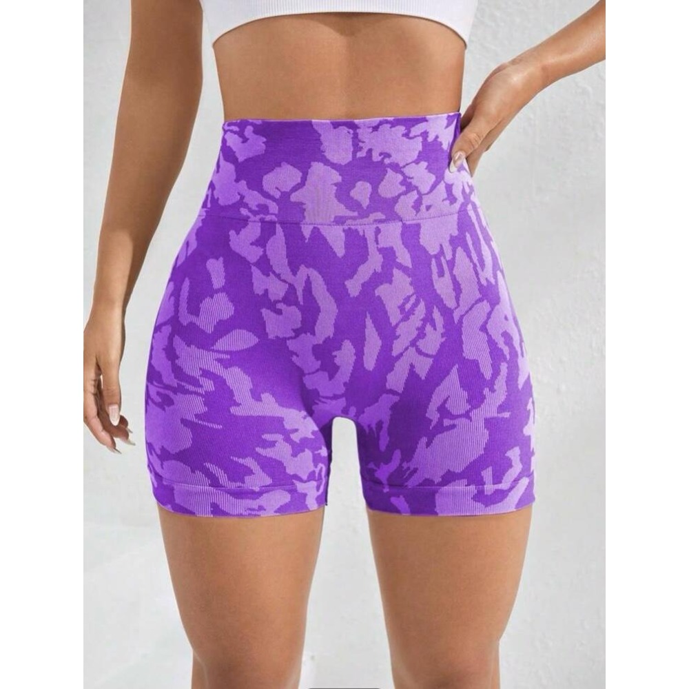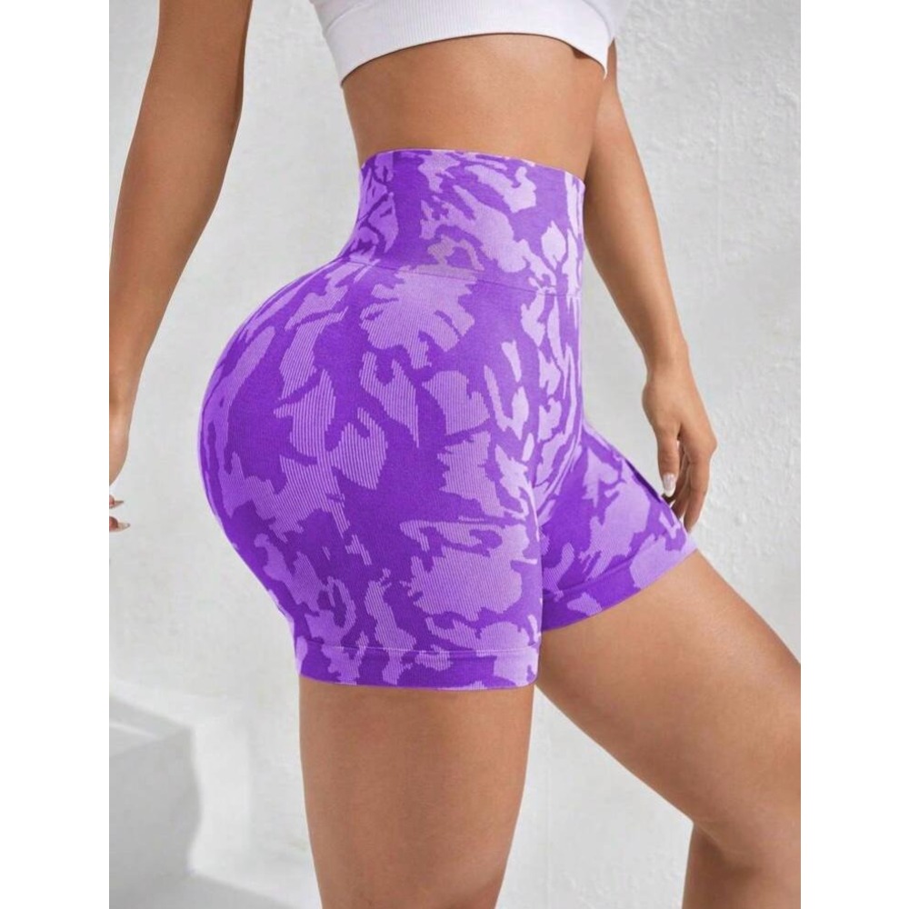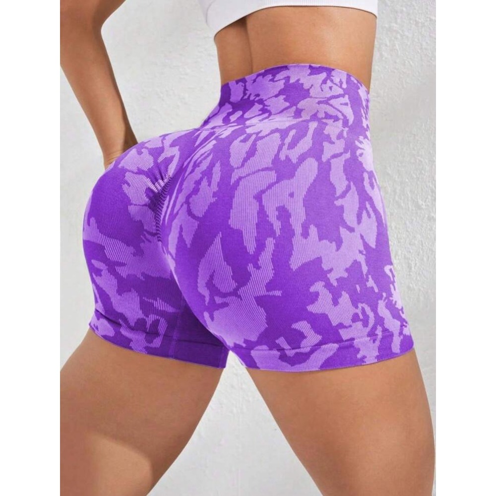 Yüksek bel, arkası scrunch (büzgülü), geniş bel bantlı, dikişsiz, camo baskı, orta esneklikte spor şort.