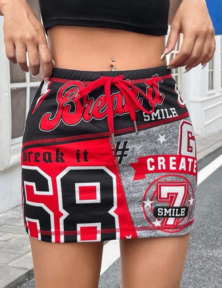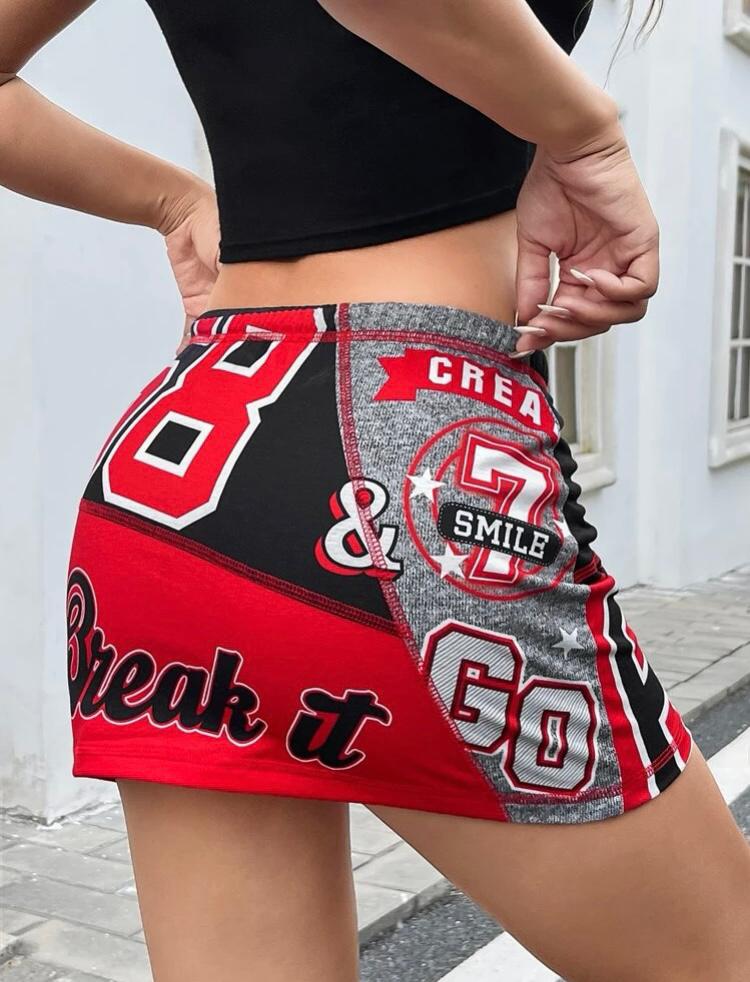 Grafik baskılı, çok renkli, yüksek esnekliğe sahip, spor kısa etek. Örme kumaştır. Kumaş içeriği: %95 Polyester, %5 Elastan.
